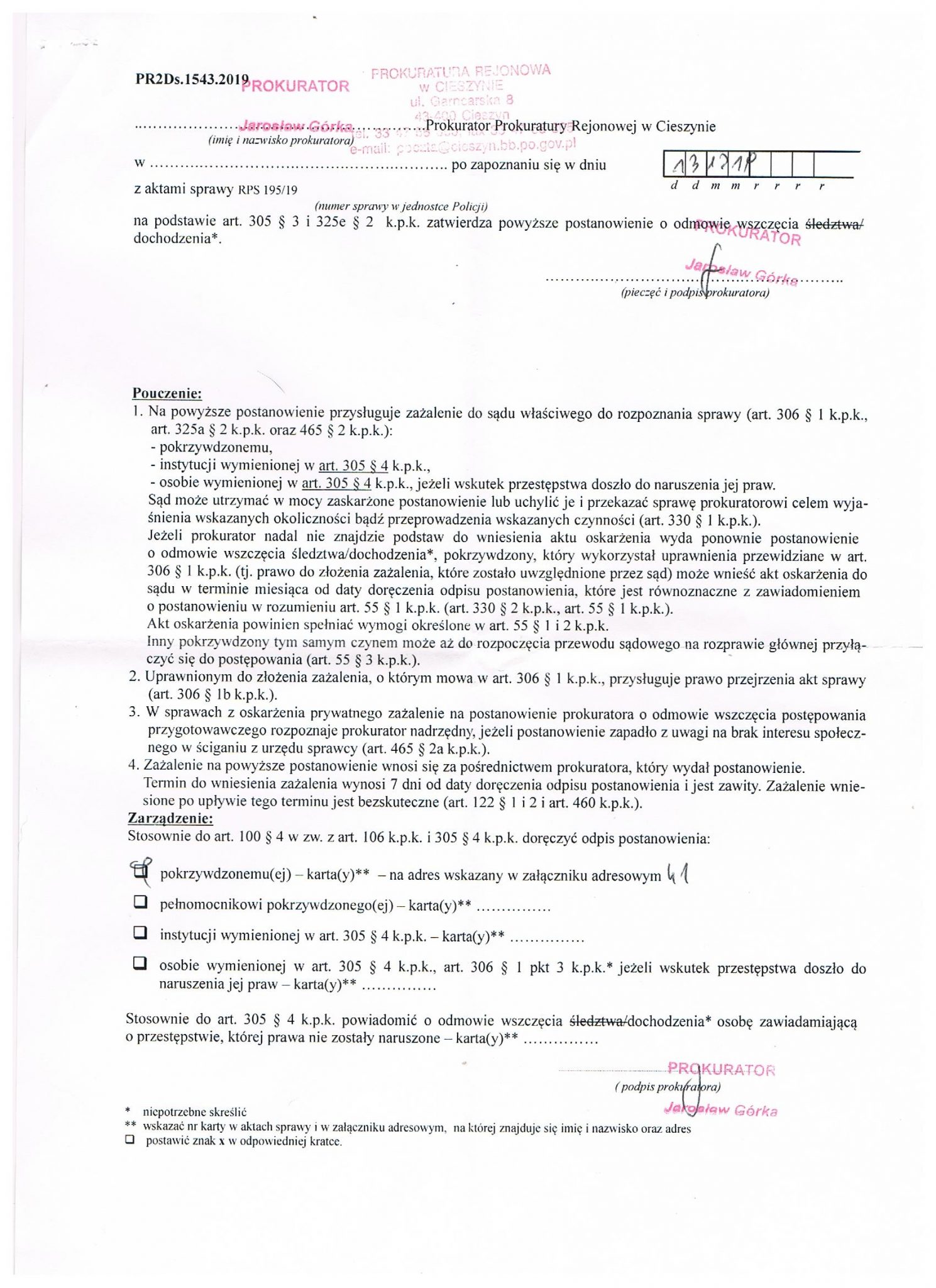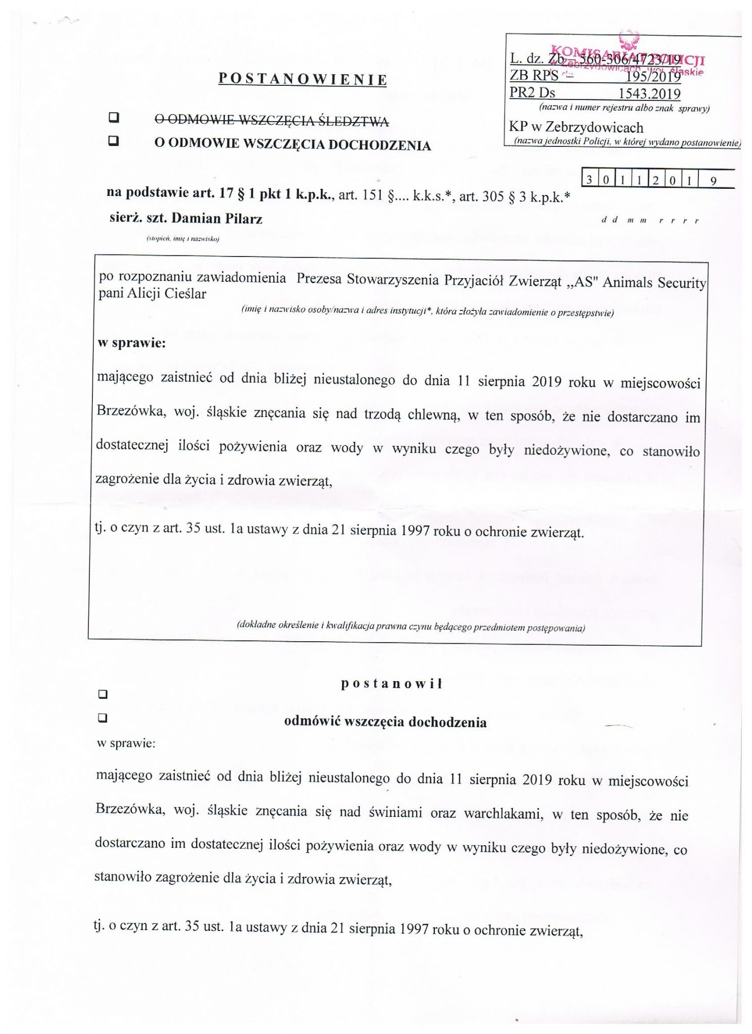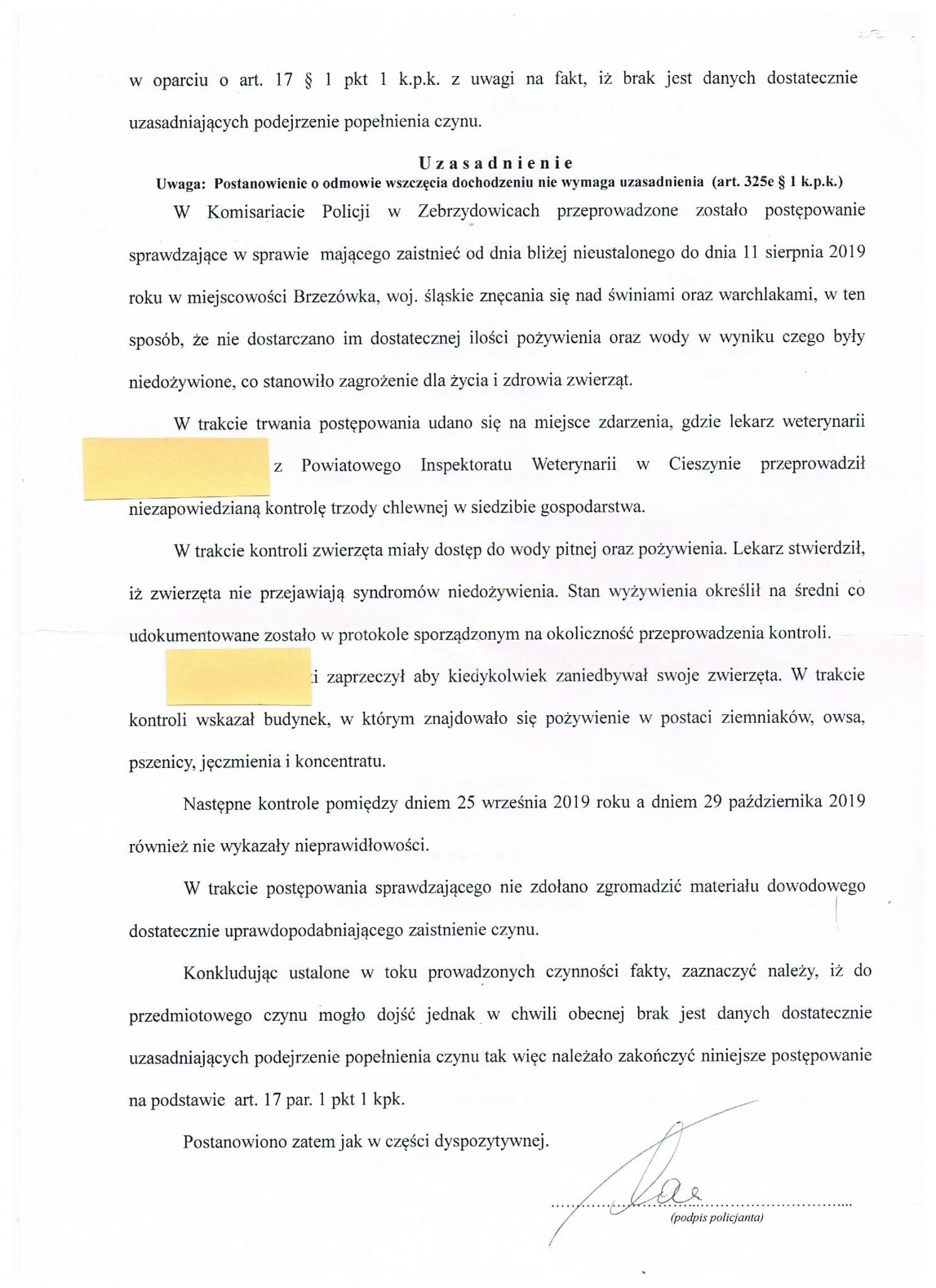 Po zgłoszeniu przez nas zawiadomienia o możliwości popełnienia przestępstwa, właściciel przez kilka tygodni nie wpuszczał na swój teren lekarza z Powiatowego Inspektoratu Weterynarii w Cieszynie, uniemożliwiając przeprowadzenie kontroli bezpośrednio po zdarzeniu. Kontrole udało się przeprowadzić po kilku tygodniach. Szkoda, że tego wszystkiego nie wziął pod uwagę prokurator…